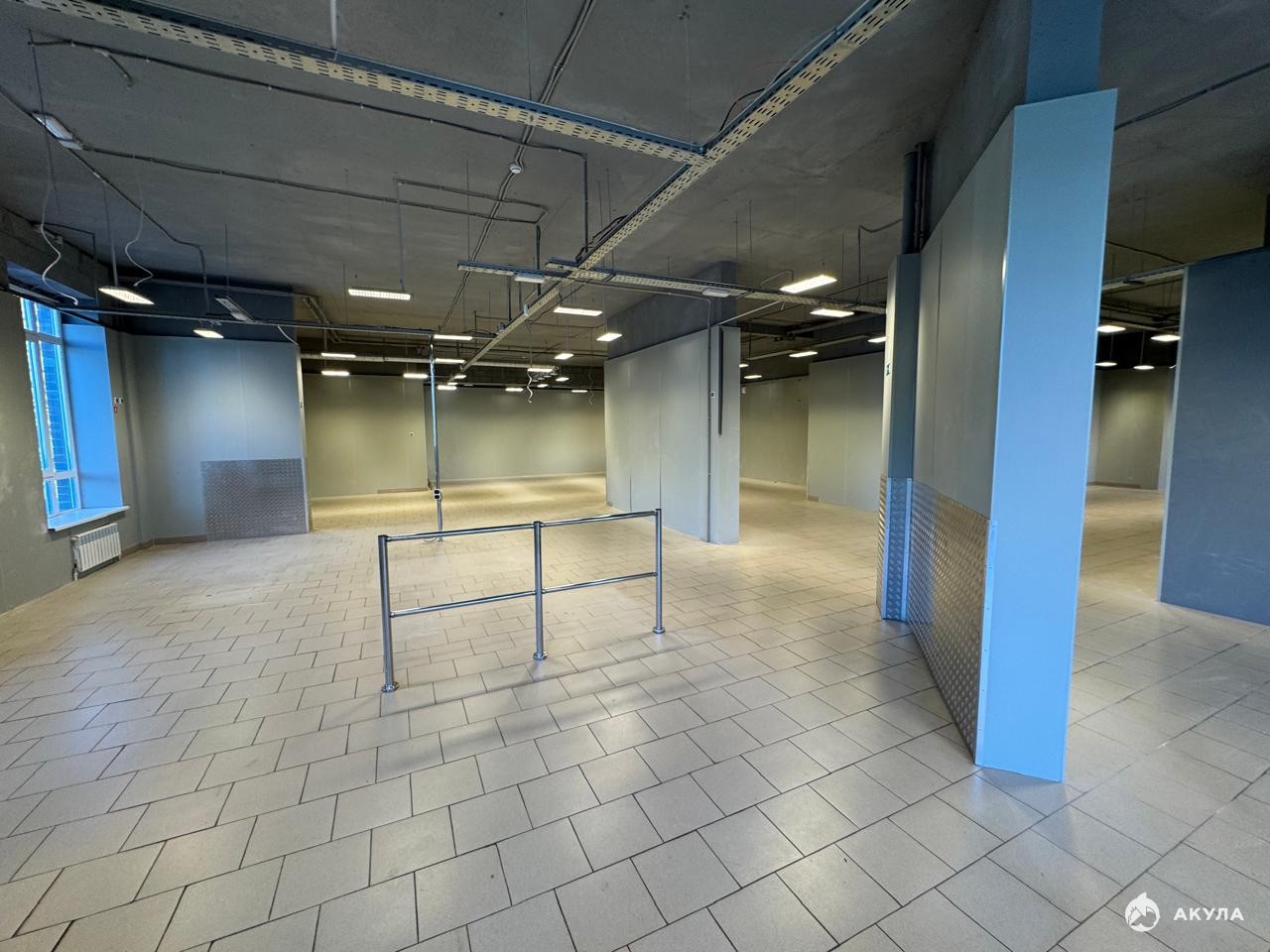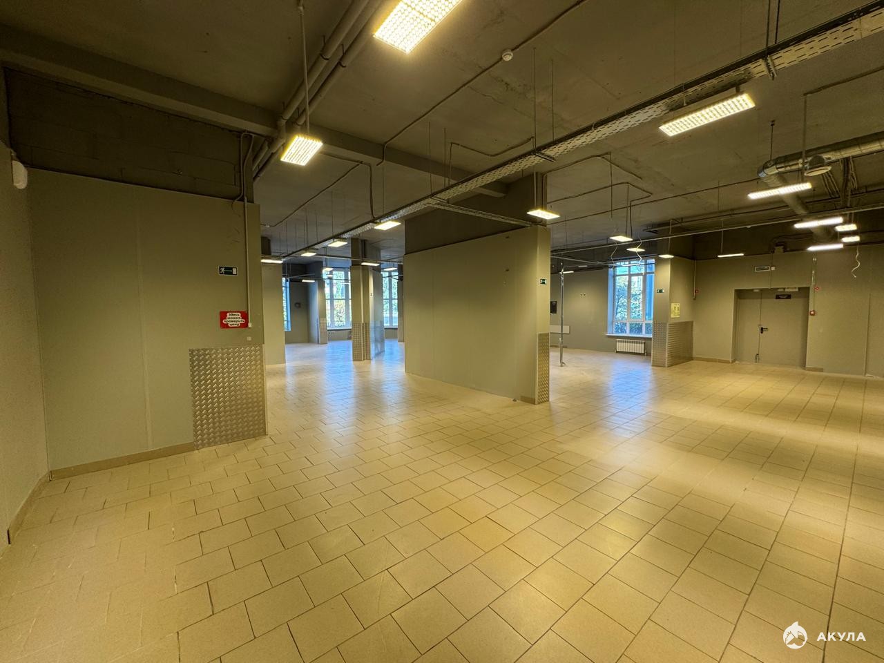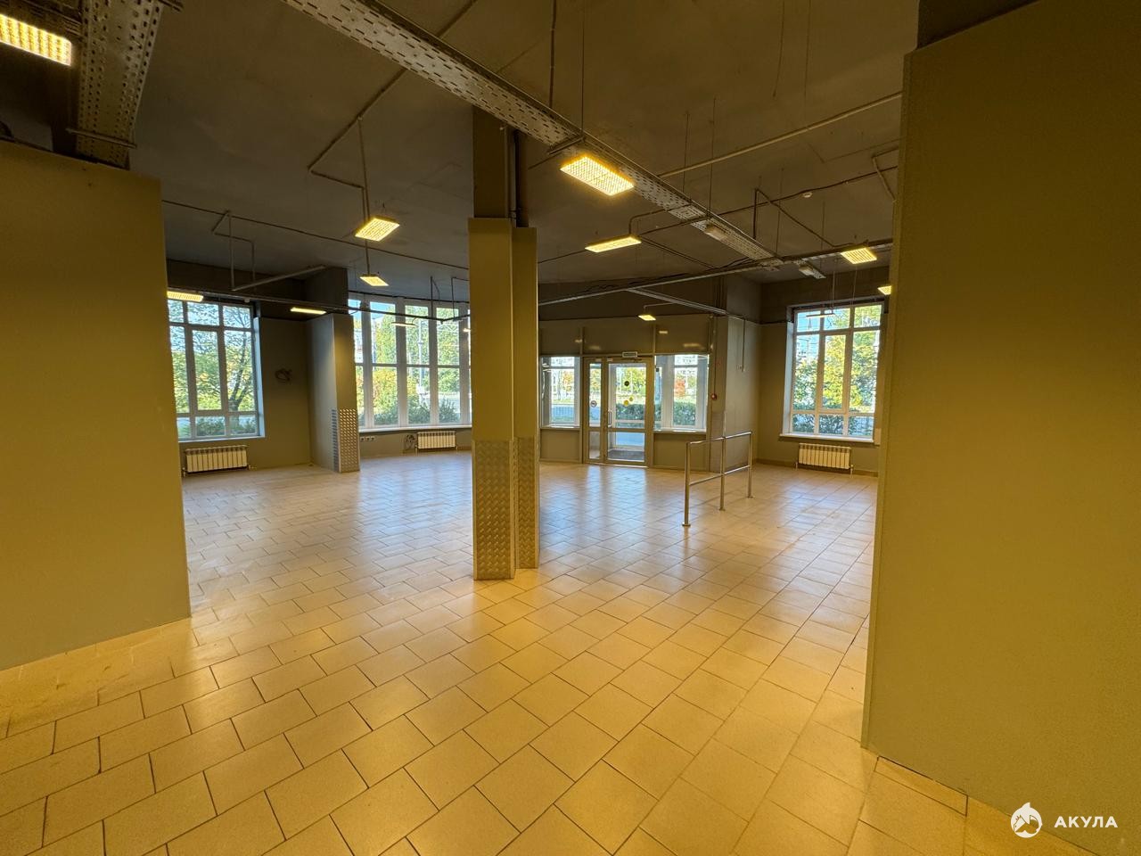 Высота потолков 4 м, внутри типовой ремонт, на полу плитка, одна мокрая точка, тип окон - витринные, окна выходят на улицу.