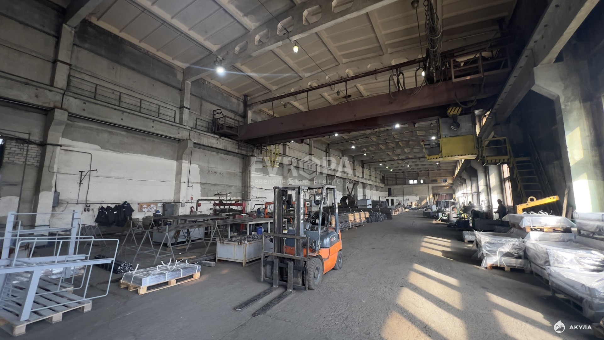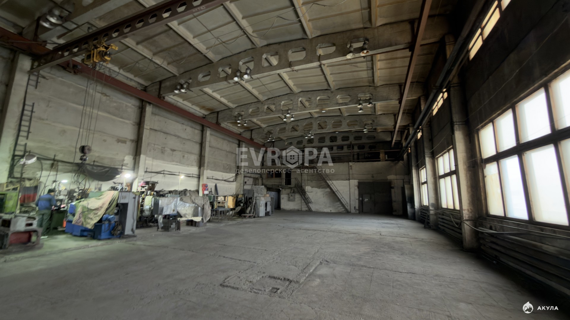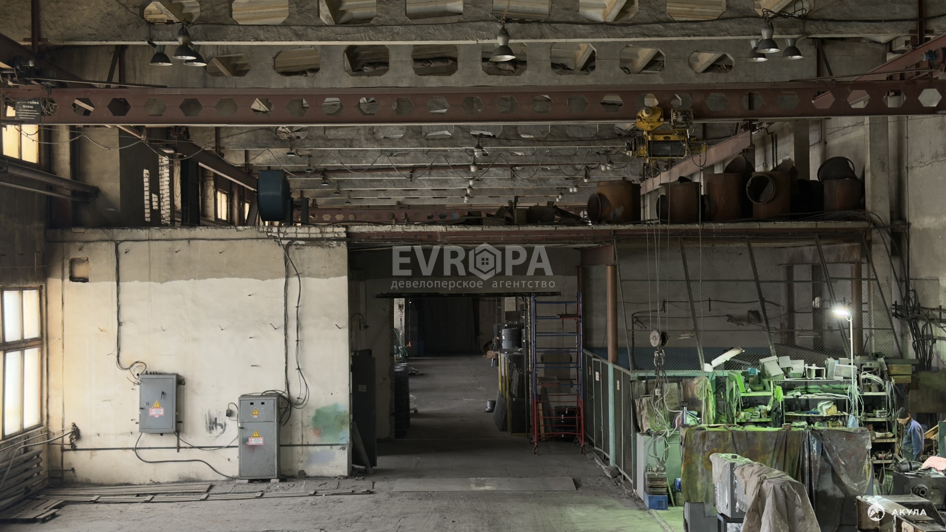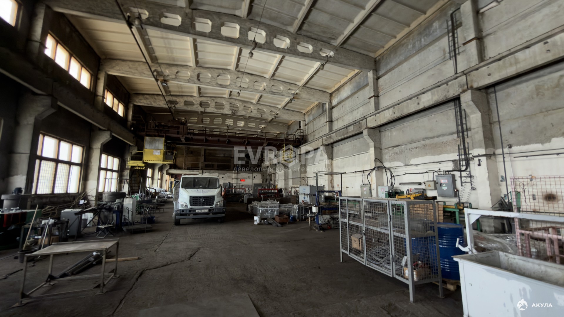 Примечание: Оборудование: кран-балка 5 т — 2 шт., кран-балка 1 т — 1 шт., мостовой кран — 20 т. Въездные ворота для фур. Бетонный пол. К корпусу примыкает четырёхэтажное здание АБК с офисными и бытовыми помещениями.