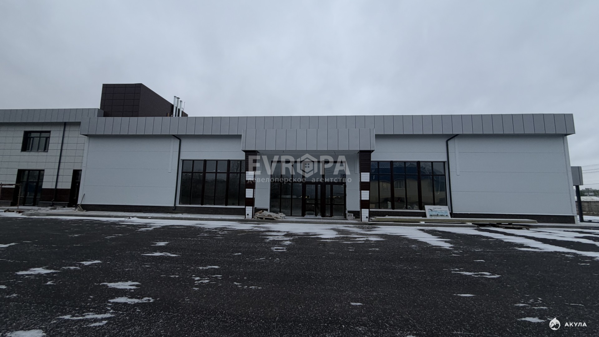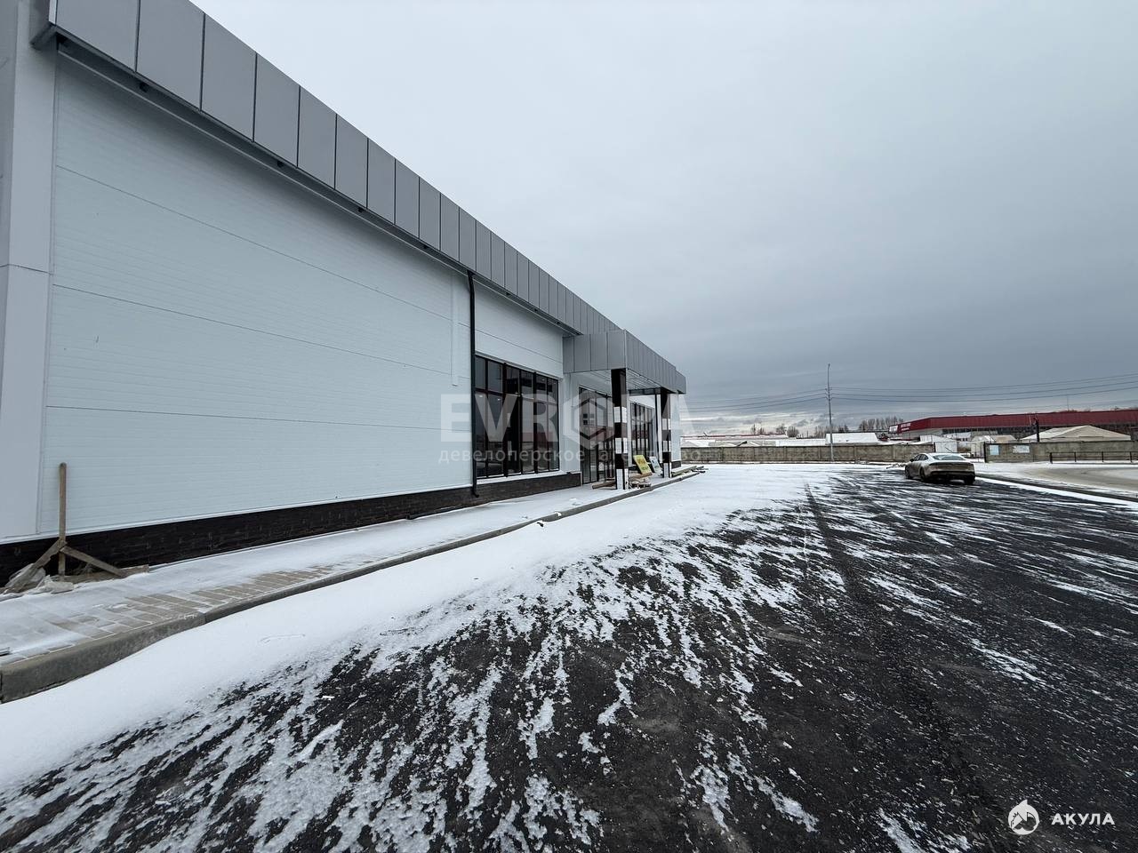 Удобство: Просторная асфальтированная парковка перед фасадом.