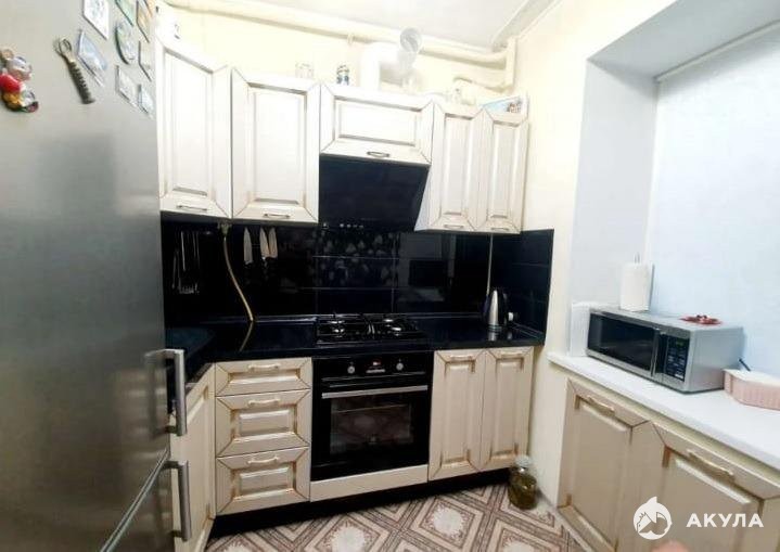 Полностью оборудованная кухня: холодильник, плита с 4 конфорками, духовка, микроволновка, электрический чайник, небольшой набор посуды.