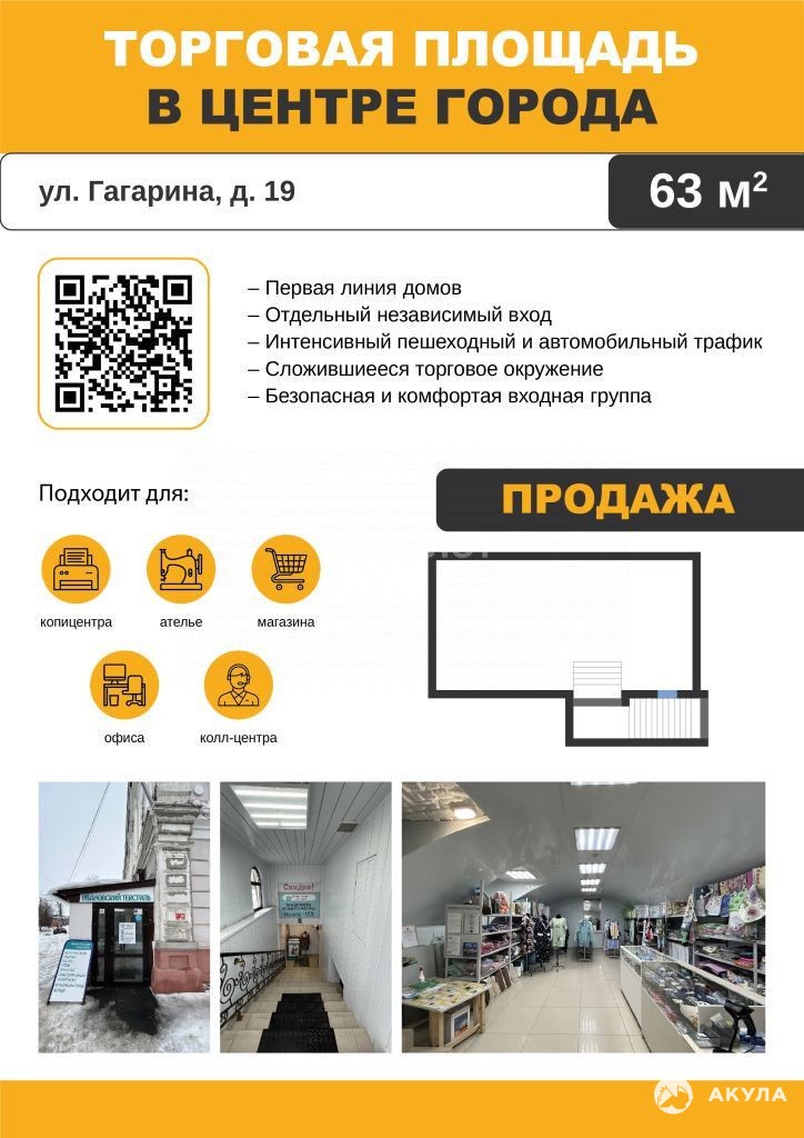 Арт. 70155541 < br> Хотите НАЧАТЬ СВОЙ БИЗНЕС УЖЕ ЗАВТРА? У нас есть идеальный вариант для Вас! < br> ТОРГОВОЕ ПОМЕЩЕНИЕ с СОБСТВЕННОЙ ВХОДНОЙ ГРУППОЙ в самом ЦЕНТРЕ ГОРОДА общей площадью 63 кв.м на ул. Гагарина д.19. в мкр. "Старый город". < br> < br> Помещение расположено в цокольном этаже двухэтажного торгового комплекса. Есть все условия для быстрой окупаемости. < br> < br> Помещение идеально подойдет для магазина, call-центра, ателье, копицентра, небольшого офиса. Оно оснащено абсолютно всеми ресурсами для комфортного ведения дел и под любой вид деятельности. Учитывая индивидуальность входа, Вы можете планировать график занятости автономно от других. < br> < br> Разберем ПРЕИМУЩЕСТВА: < ul> < li data-list"bullet"> < span class"ql-ui" contenteditable"false"> < /span> ПЕРВАЯ ЛИНИЯ домов. < /li> < li data-list"bullet"> < span class"ql-ui" contenteditable"false"> < /span> УДАЧНОЕ РАСПОЛОЖЕНИЕ с интенсивным пешеходным и автомобильным трафиком.< /li> < li data-list"bullet"> < span class"ql-ui" contenteditable"false"> < /span> ОТЛИЧНЫЙ РЕМОНТ: напольное покрытие в виде кафельной плитки, потолочное и настенное покрытие-в виде ПВХ панелей. Несмотря на свою компактность, офис очень просторный и светлый.< /li> < li data-list"bullet"> < span class"ql-ui" contenteditable"false"> < /span> СИСТЕМА ВИДЕОНАБЛЮДЕНИЯ, пожарная сигнализация.< /li> < li data-list"bullet"> < span class"ql-ui" contenteditable"false"> < /span> Отдельный НЕЗАВИСИМЫХ ВХОД с безопасной и комфортной лестницей.< /li> < li data-list"bullet"> < span class"ql-ui" contenteditable"false"> < /span> ПОМЕЩЕНИЕ очень светлое, чистое С ПРЕКРАСНЫМ ОСВЕЩЕНИЕМ, отличная возможность для удобного и комфортного размещения будущего арендатора.< /li> < li data-list"bullet"> < span class"ql-ui" contenteditable"false"> < /span> Отличный ПОТЕНЦИАЛ РАЙОНА-одна из центральных улиц города с богатой инфраструктурой, благодаря, которой можно повысить узнаваемости торговой точки потенциальными покупателями.< /li> < li data-list"bullet"> < span class"ql-ui" contenteditable"false"> < /span> УДОБНЫЙ ПОДЪЕЗД, наличие парковочных мест (с торца здания), близость остановок общественного транспорта и транспортной развязки.< /li> < li data-list"bullet"> < span class"ql-ui" contenteditable"false"> < /span> СЛОЖИВШЕЕСЯ ТОРГОВОЕ ОКРУЖЕНИЕ, рядом расположились: ТЦ Сквер, ТЦ Центральный, ТЦ Астра Сити, ТЦ Империя, магазин, продуктовый рынок, Гостиный двор, ТЦ Прага, аптеки, сеть магазинов Магнит, Пятерочка, Победа.< /li> < li data-list"bullet"> < span class"ql-ui" contenteditable"false"> < /span> Отличная визуализация и РЕКЛАМНЫЙ ПОТЕНЦИАЛ.< /li> < li data-list"bullet"> < span class"ql-ui" contenteditable"false"> < /span> Все системы инженерных коммуникаций от центральных городских сетей, работают исправно.< /li> < /ul> < br> < br> БОГАТАЯ ИНФРАСТРУКТУРА в шаговой доступности. Большие возможности для реализации своих идей. < br> Вы в шаге от своей мечты! Становитесь владельцем и преуспевайте в бизнесе и жизни!