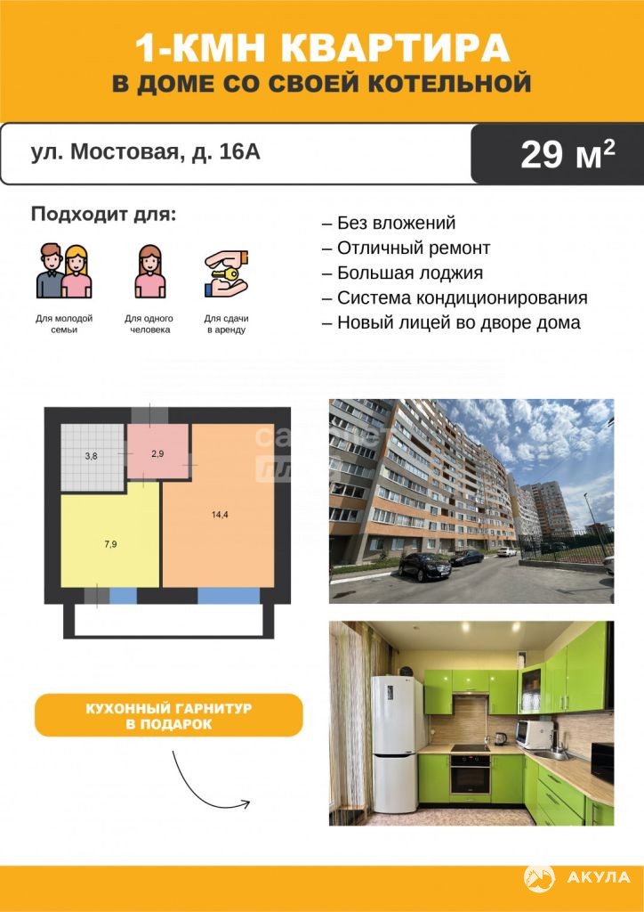 Отличная ОДНОКОМНАТНАЯ КВАРТИРА 29 м в МОЛОДОМ ДОМЕ с автономной котельной, расположенная на удобном 14 этаже дома 16А по ул. Мостовая в мкр. Порт.