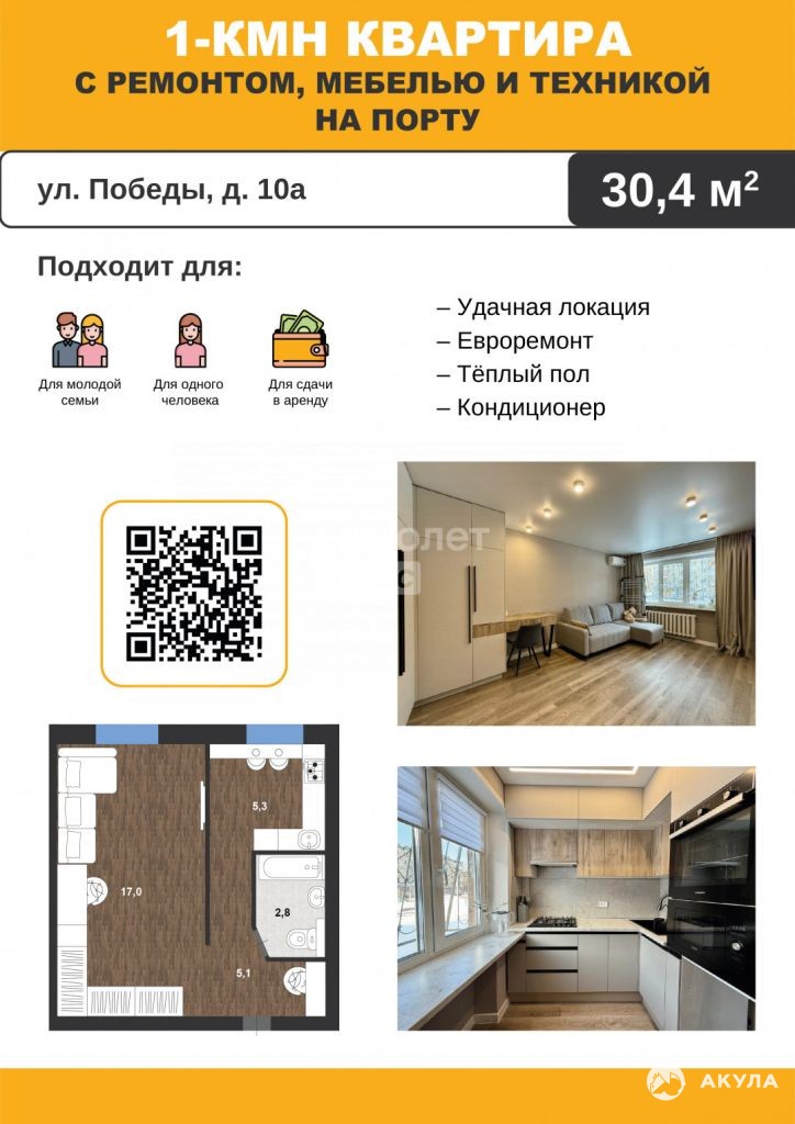 Современная ОДНОКОМНАТНАЯ КВАРТИРА с РЕМОНТОМ, МЕБЕЛЬЮ и ТЕХНИКОЙ в центре Порта, на ул. Победы, д. 10а.