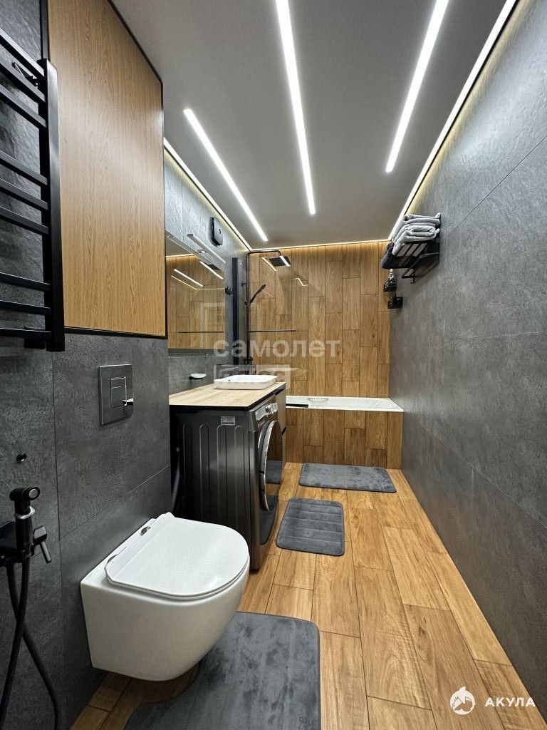 -СОВМЕЩЕННЫЙ САНУЗЕЛ с превосходной дизайнерской отделкой, суперсовременным сантехническим оборудованием, стиральном машиной и мебелью из влагостойких материалов.