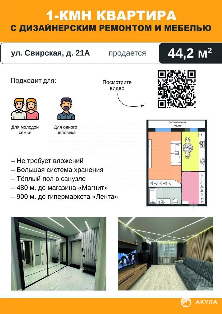 ОДНОКОМНАТНАЯ КВАРТИРА с ДИЗАЙНЕРСКИЙ РЕМОНТОМ, общей площадью 44, 2 кв.м., на девятом этаже десятиэтажного жилого дома на ул. Свирская, д. 21А