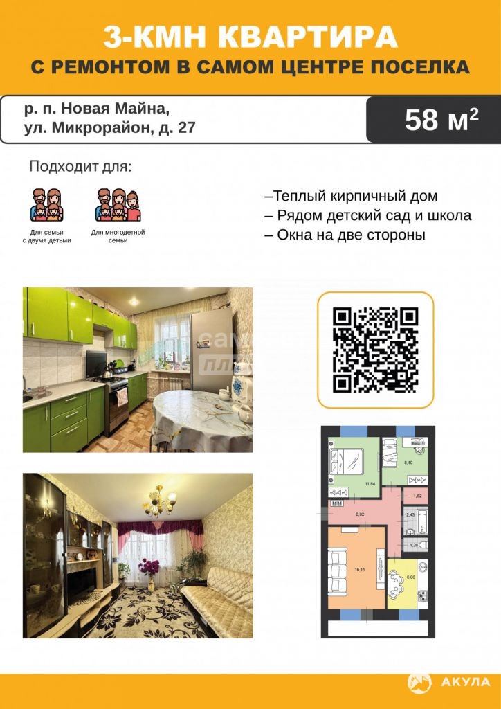 ТРЕХКОМНАТНАЯ КВАРТИРА с РЕМОНТОМ площадью 57, 5 м в одном из самых ближайших населенных пунктов г. Димитровграда, в самом центре р.п. Новая Майна Мелекесского района, на улице Микрорайон д.27