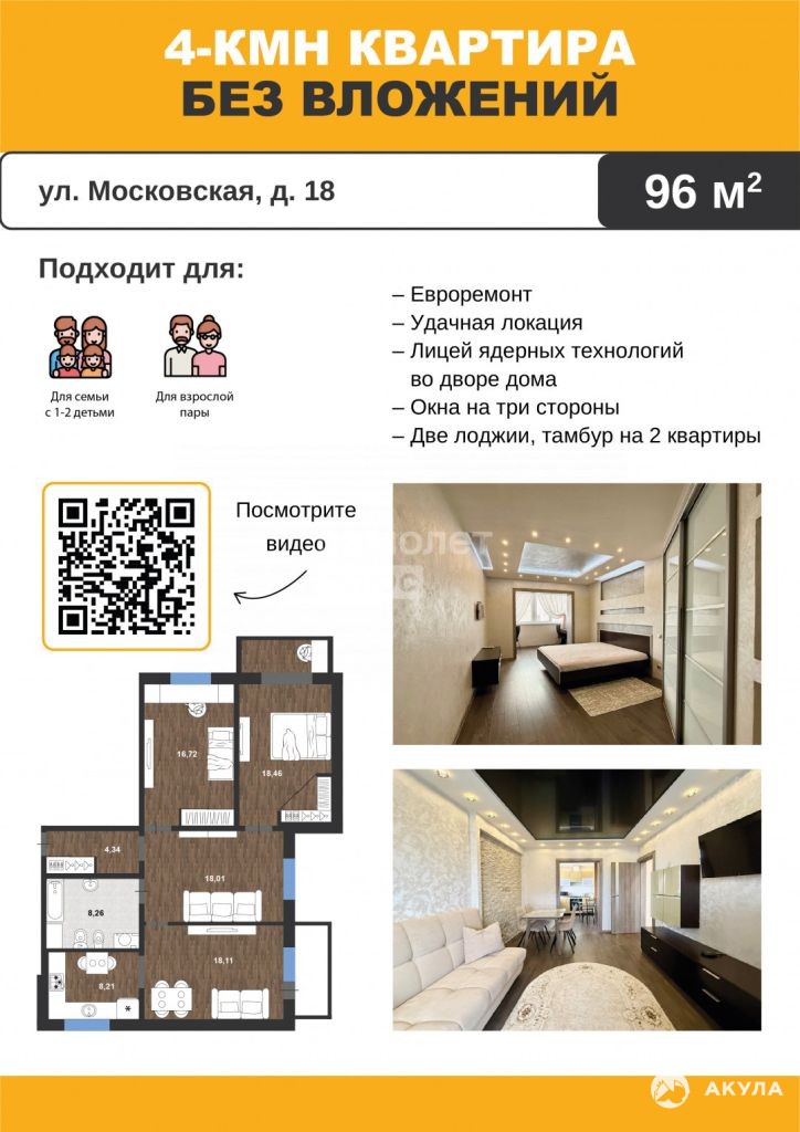 Шикарная ЧЕТЫРЕХКОМНАТНАЯ КВАРТИРА с ЕВРОРЕМОНТОМ на ул. Московская, для счастливой жизни семьи с 1-2 детьми. И главное: совершенно не требует вложений! Просто заезжай и живи.