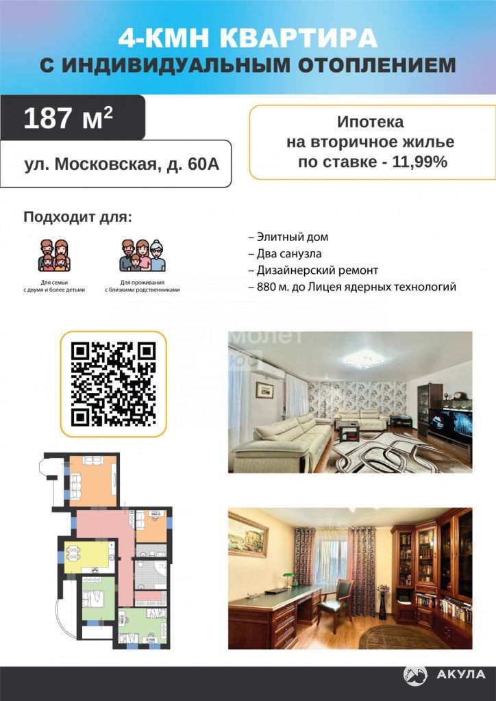 Шикарная ЧЕТЫРЕХКОМНАТНАЯ КВАРТИРА 187 м С ИНДИВИДУАЛЬНЫМ ОТОПЛЕНИЕМ на 8 этаже элитного дома на ул. Московская, д. 60А