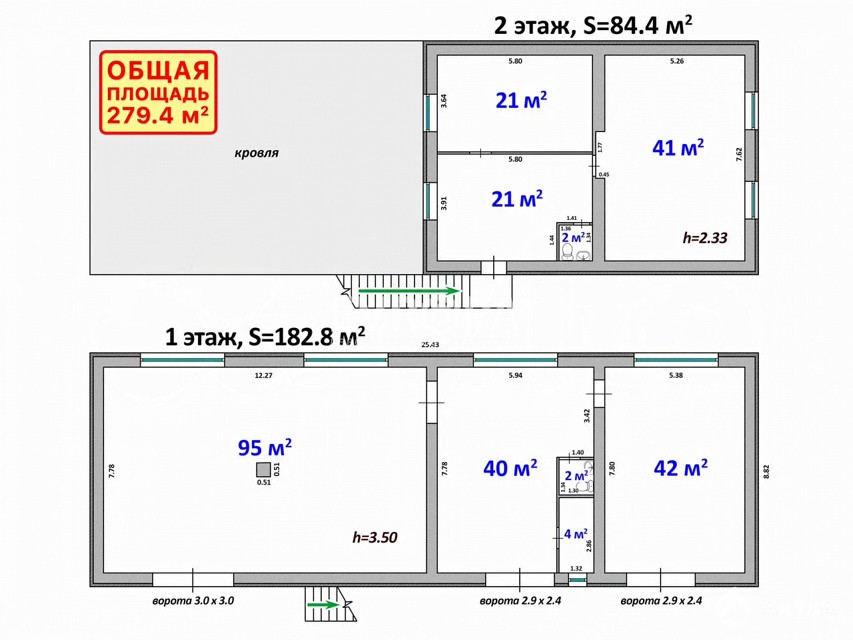 Площадь: 279.4 кв.м. (первый этаж — рабочая зона, второй — офисная часть).