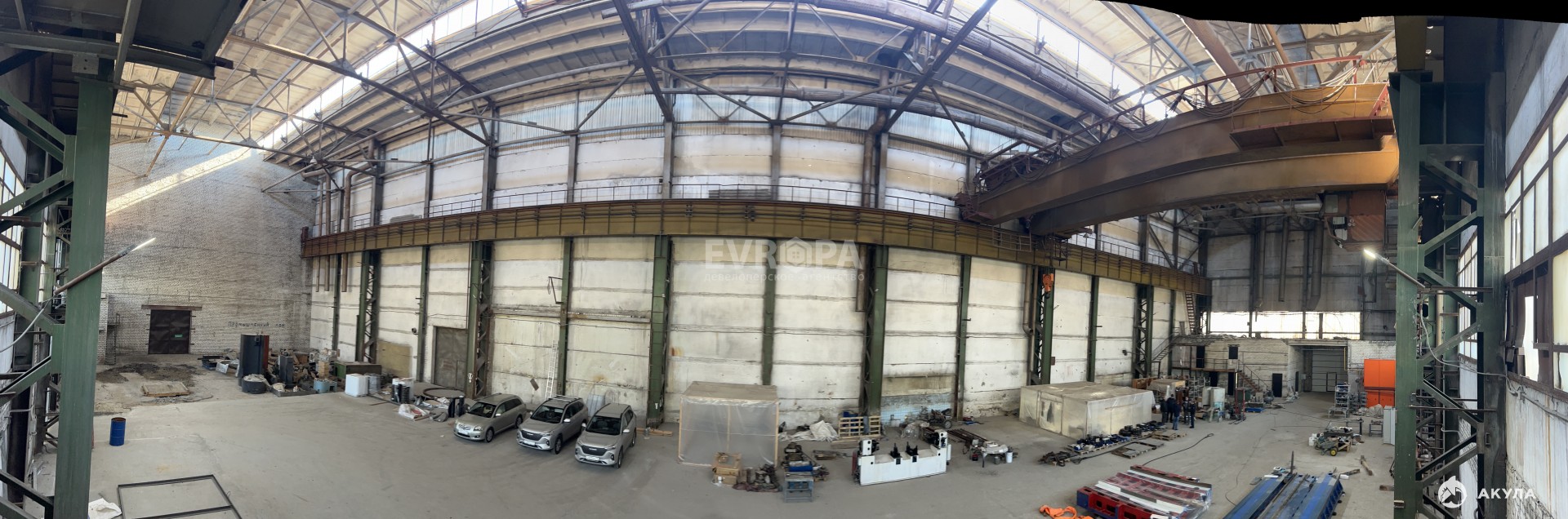 Высота потолков: 14 м имеются подъемные механизмы грузоподъемностью 5 и 15 тонн.
