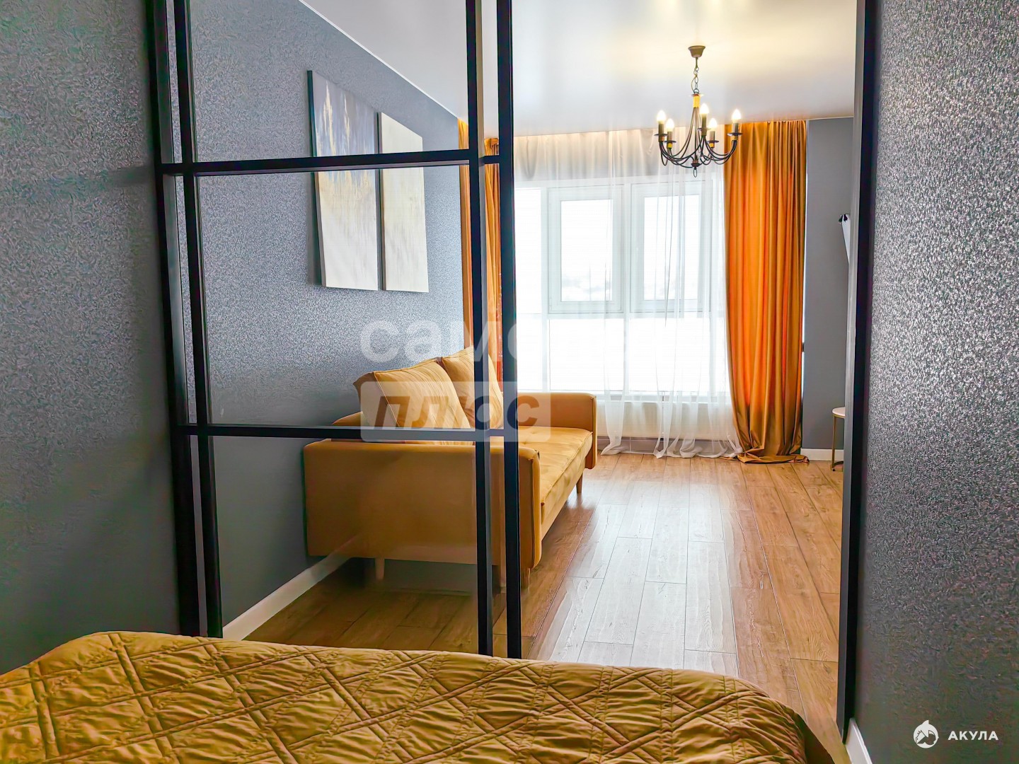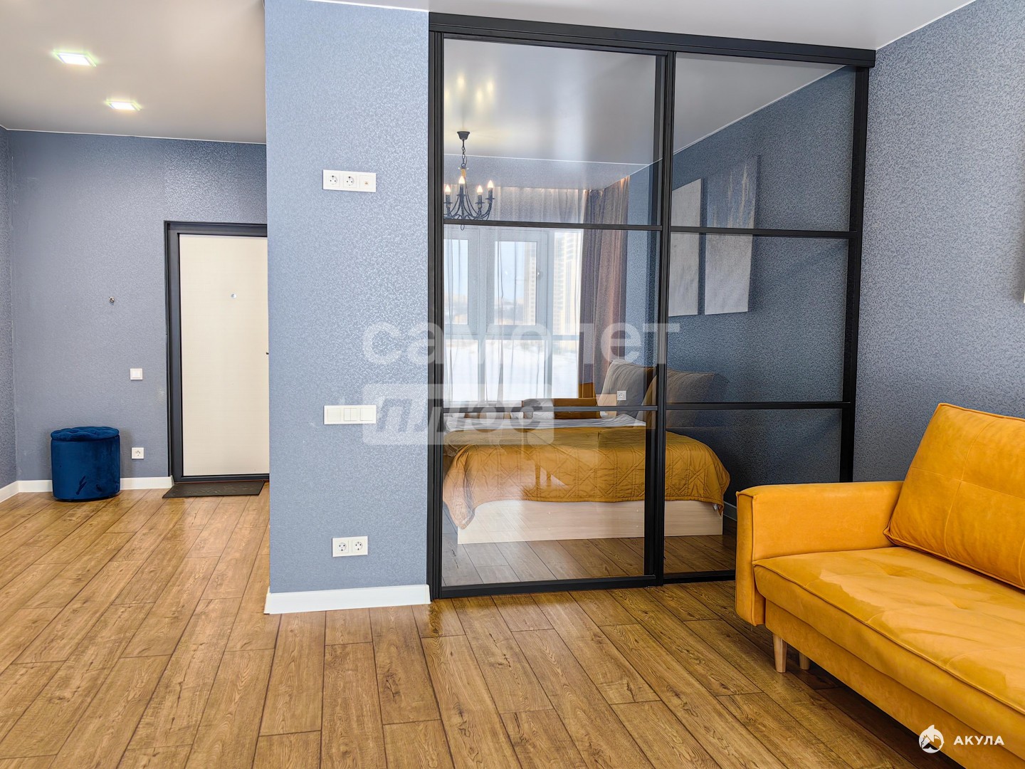 Общая площадь квартиры 48 кв.м. Жилая комната при этом 20 кв.м., кухня - 12 кв.м., коридор - 9 кв.м. Кухня совмещена с гостиной — пространство наполняется светом и выглядит визуально больше. Спальная зона отделена стеклянными перегородками, что сохраняет приватность и визуальную лёгкость. В коридоре установлен встроенный шкаф.