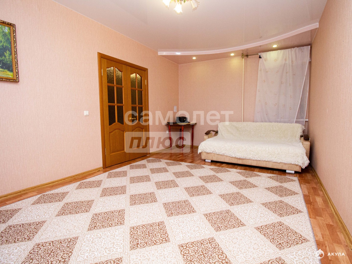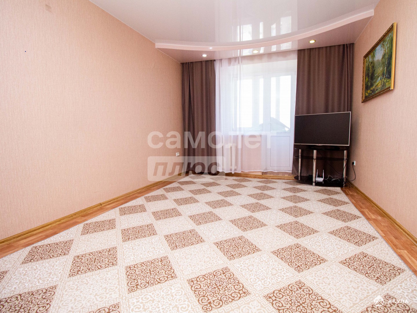 ОБЪЕКТ:просторная комната с выходом на лоджиюокна пластиковыепотолок натяжнойполы линолеумдверь межкомнатная распашная, дерево с стеклянной вставкой