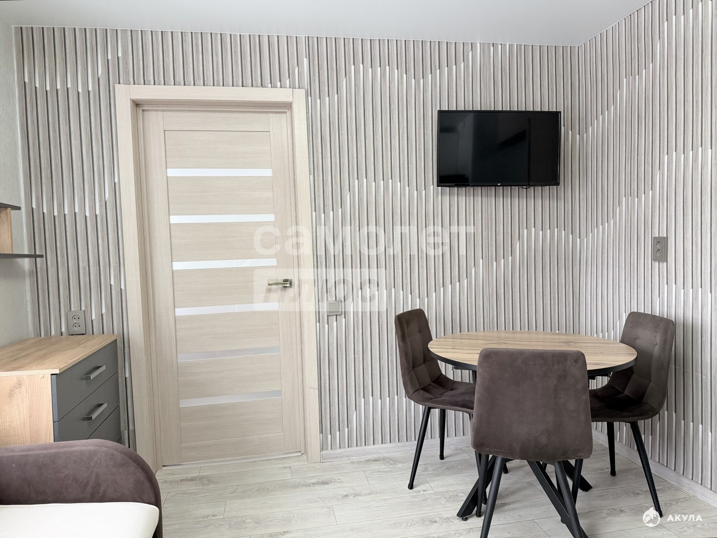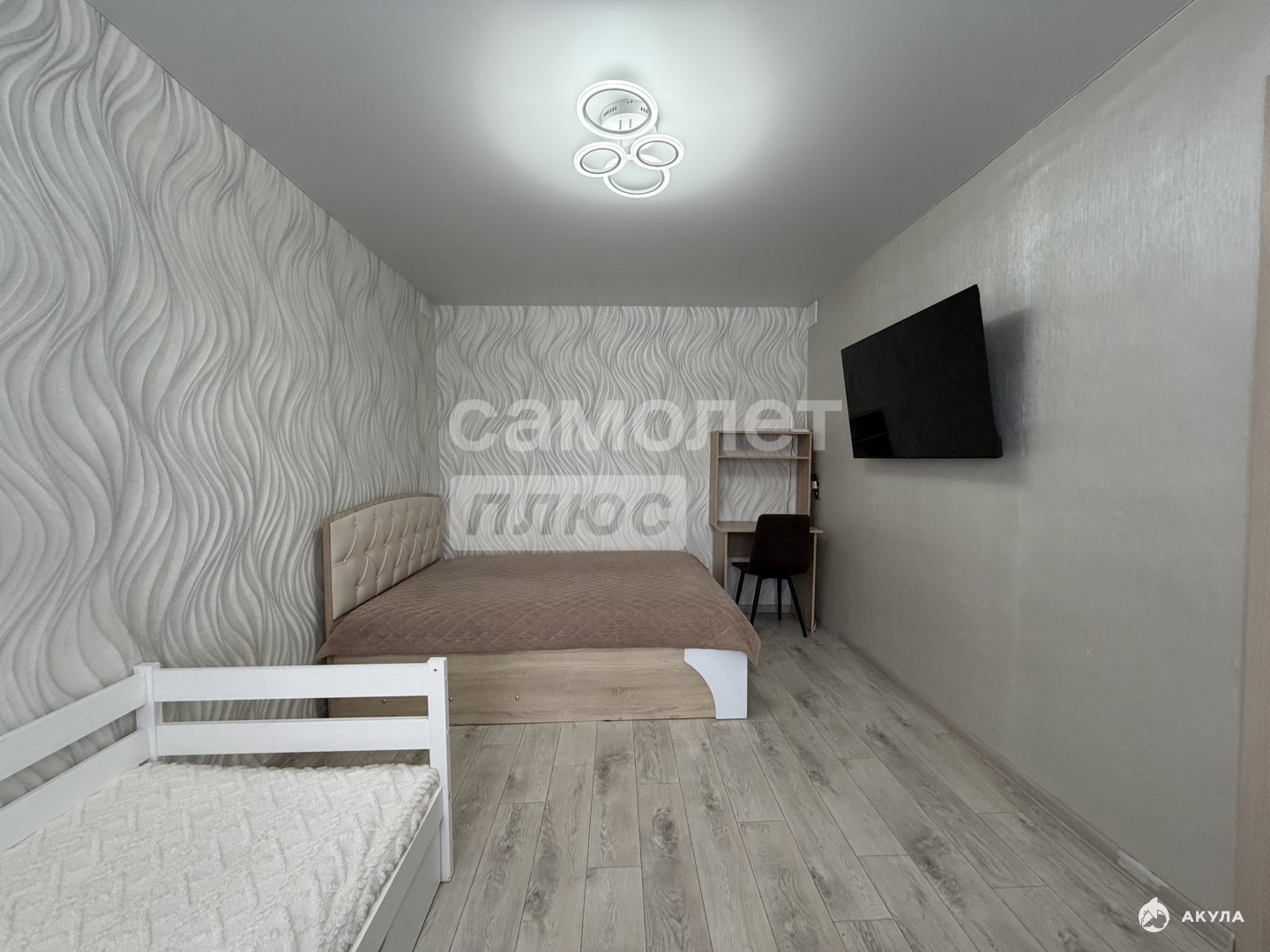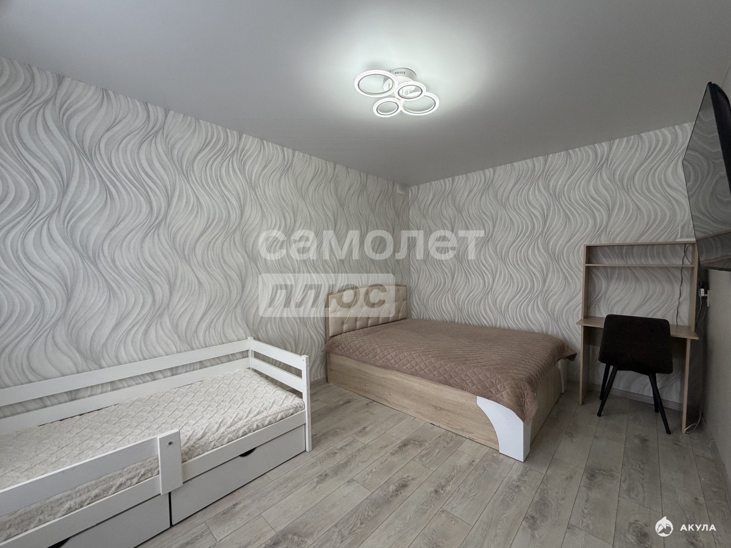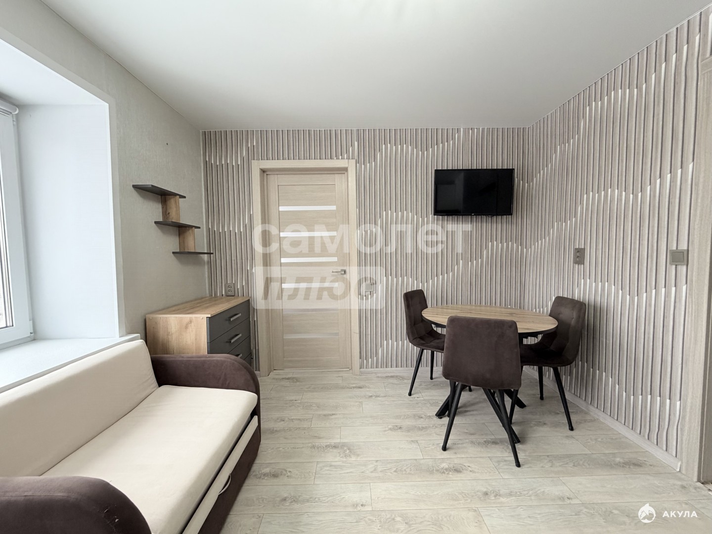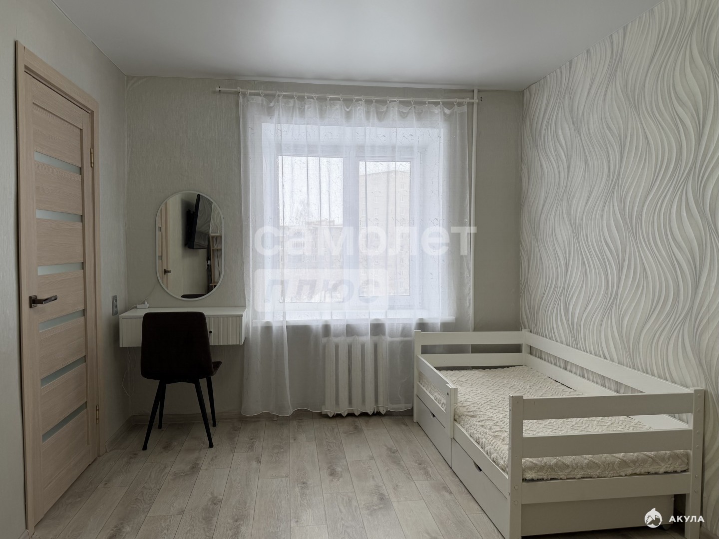 -в комнате остаётся туалетный столик с зеркалом (с подсветкой), на окнах рулонные шторы, гардина и занавеска.