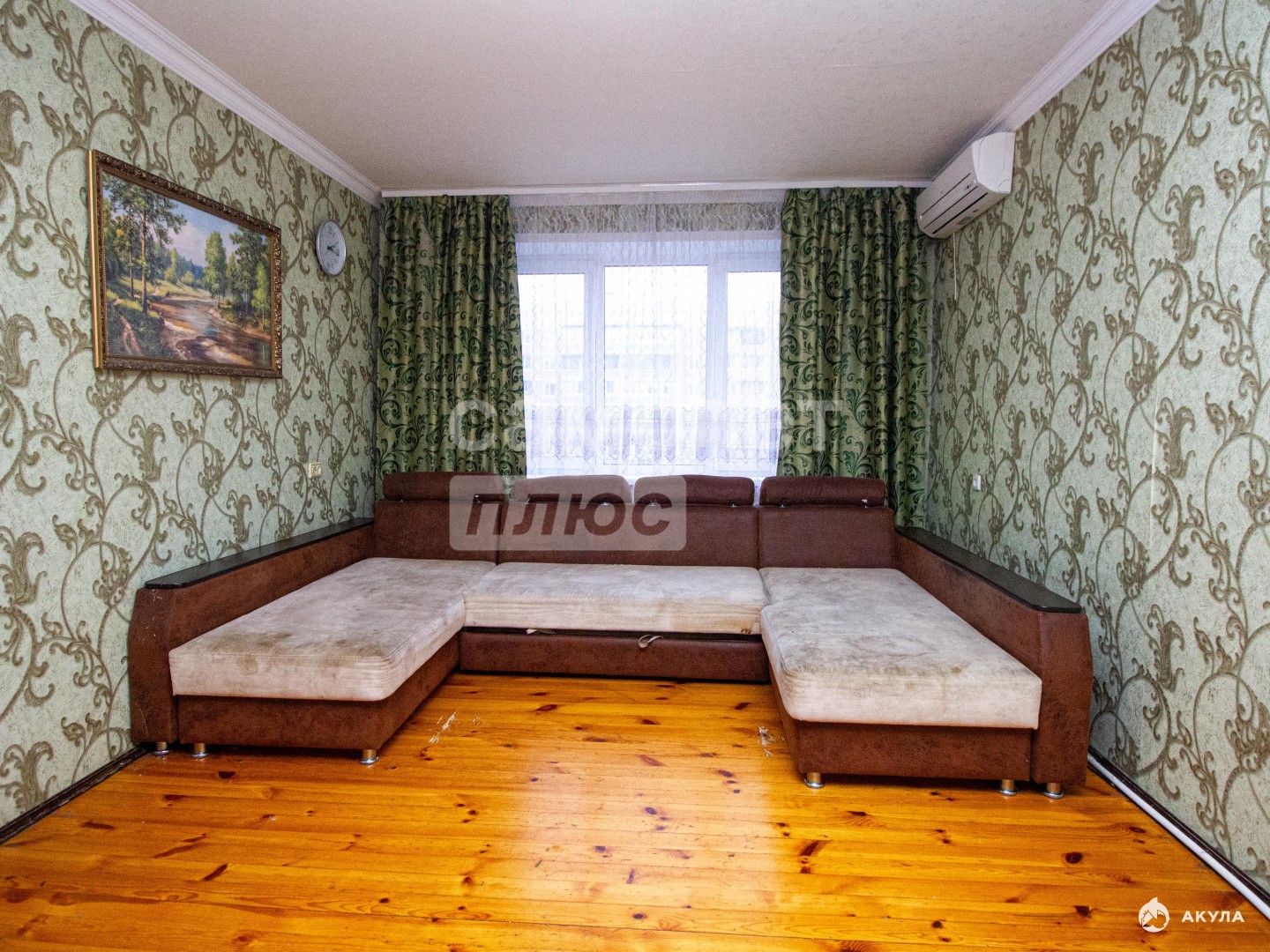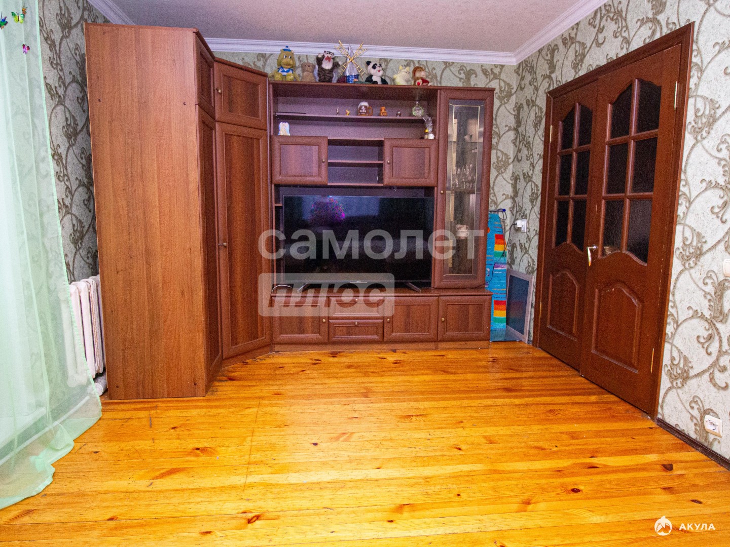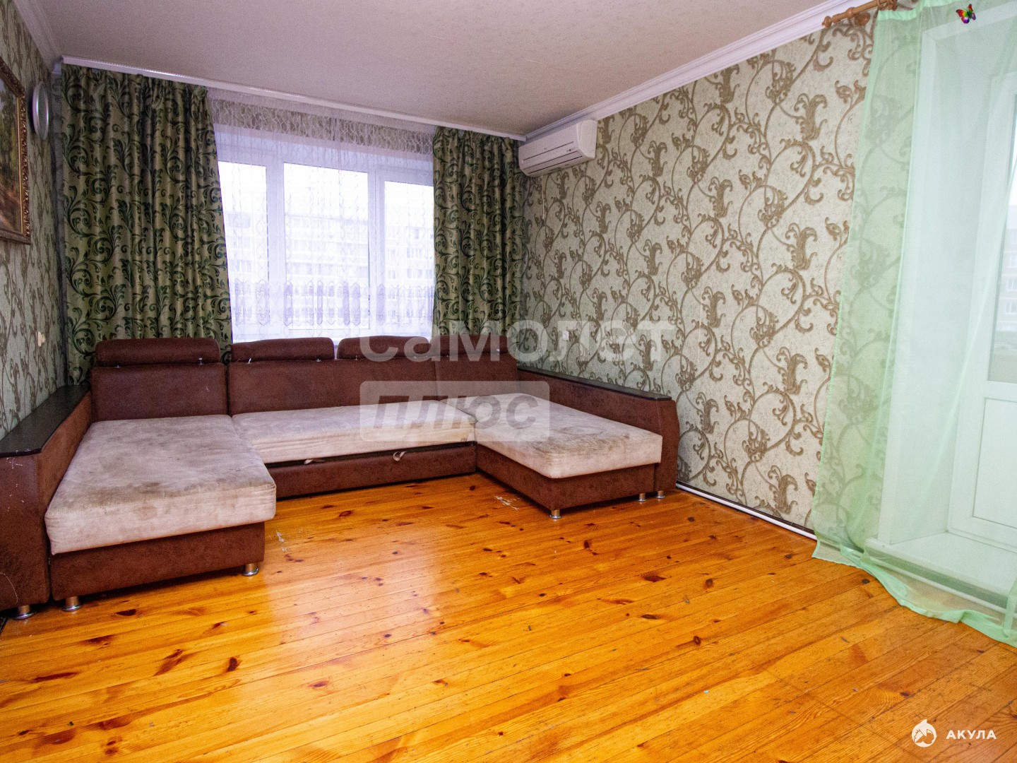 Остаются новым жильцам: кухонный гарнитур, электрическая плита, диван в зале, спальный гарнитур, занавески.
